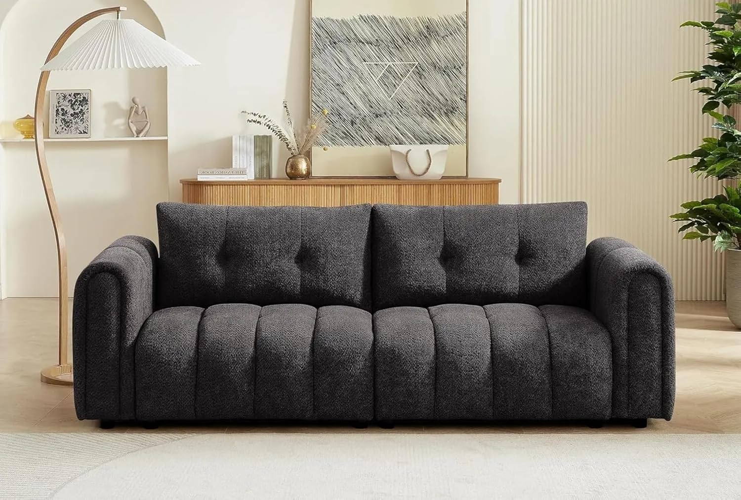 91.5-inch Modern Cloud Sofa - Ultra-Soft Lambswool Deep-Seated Three-Seater Living Room Sofa Use high-quality images or videos to showcase the sofa's soft texture, deep seating features, and its appearance in a real living room setting.