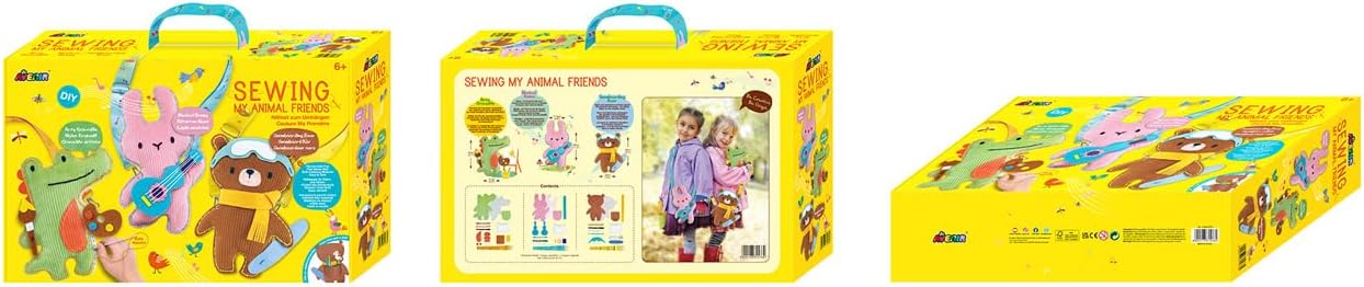 This sewing kit includes everything it takes to sew your own three stuffed animals. The set promotes children's fine motor skills. Plush toy dimensions: 23 x 21 cm. The philosophy of Avenir: children can simply try and let their creativity run wild. Please note: Not suitable for children under 3 years. Choking hazard. Small parts.