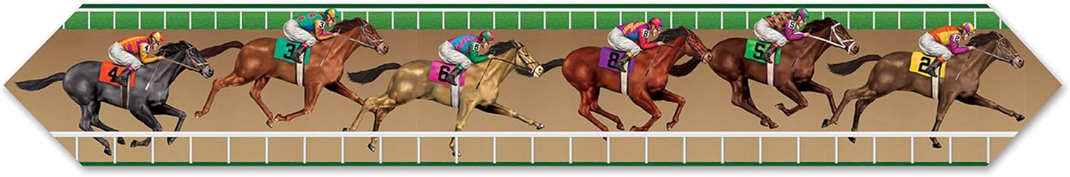 Beistle Horse Racing Table RunnerElevate your horse racing or western-themed party with our Printed Horse Racing Table Runner. Measuring 11 inches long by 6 feet wide, this premium quality table runner is crafted from glossy stock paper, ensuring durability and a polished finish to your decor. The elegant tassels attached at each end add a charming western touch, enhancing the overall theme of your event. Perfect for adorning buffet tables, dining tables, or dessert displays, this versatile table runner effortlessly complements your tableware, creating a cohesive and stylish ambiance. Whether you're hosting a horse racing day celebration or a western gathering, this table runner is sure to impress your guests and make a statement. Add the finishing touch to your party decor and make memories that will last a lifetime with our Printed Horse Racing Table Runner.
