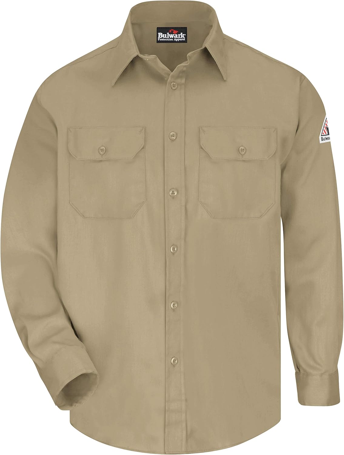 Bulwark Excel FR ComforTouch uniform shirt. Fabric made of 6 ounces, 88 percent cotton/12 percent nylon. Gusset side seam for ease of movement. Banded topstitched collar. Two chest pockets with button flap closures and sewn-in pencil stall. Placket front with button closure. Tailored sleeve placket. Topstitched cuff. Straight back yoke. Home wash and industrial wash.