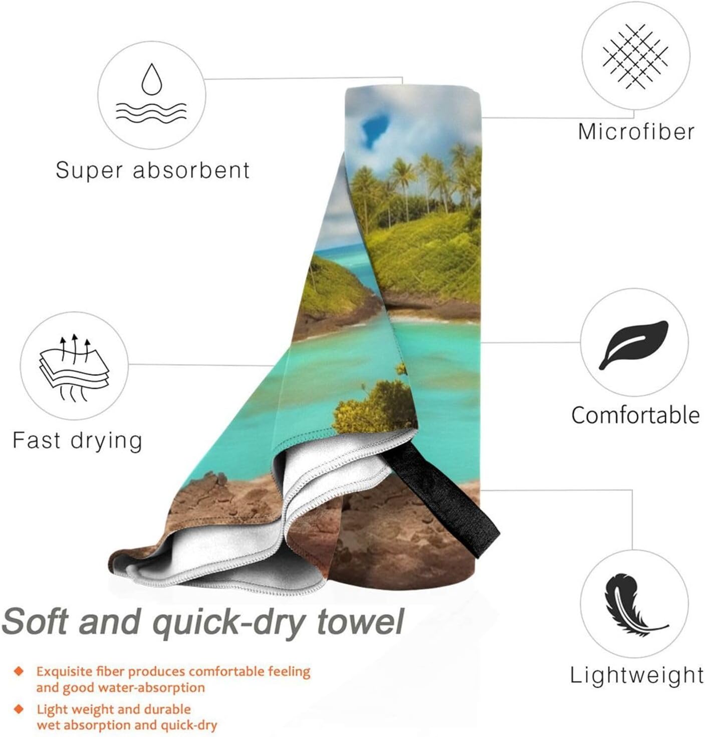 Caribbean Scenery Quick Dry Towel.Design:Full Width Single Side Printing.Material:Microfiber Material.Product Performance:Our Beach Towels Are Made Of Soft Microfiber,Smooth And Compact,With Better Water Absorption Than Ordinary Towels,This Quick-Drying Fabric Has Excellent Performance In Absorbing And Diffusing Water,Which Can Shorten The Drying Time Of Water.The Towel Comes With A Special Bag And Climbing Buckle For Easy Packing And Hanging,And Can Be Hung Anywhere For Quick Air Drying.Ultra-Lightweight And Ultra-Compact,The Towel Can Easily Be Placed In A Gym Bag Or Backpack.Climbing Buckle On The Pouch For Attaching Or Fitting Into Your Bag.Foldable Design Makes It Easy To Fold Into A Travel Bag,Store In Your Suitcase Or Backpack.The Gift Bag Is Also Suitable For Storing Cell Phones,Wallets,Sunglasses,Goggles,Swim Caps,Etc.Most Suitable For Sports,Travel Enthusiasts.Applicable Scenes:Outdoor Camping,Hiking,Beach,Travel,Gym,Home Use Are Available.Accessories:Towel With Hanging Buckle Webbing,Easy To Hang Air Dry,Pvc Bags,With Climbing Buckle,Easy To Store And Carry.Washing Instructions:Machine Washable,Wash Before First Use,Just Hand Wash Or Machine Wash,Air Dry.Please Do Not Bleach.