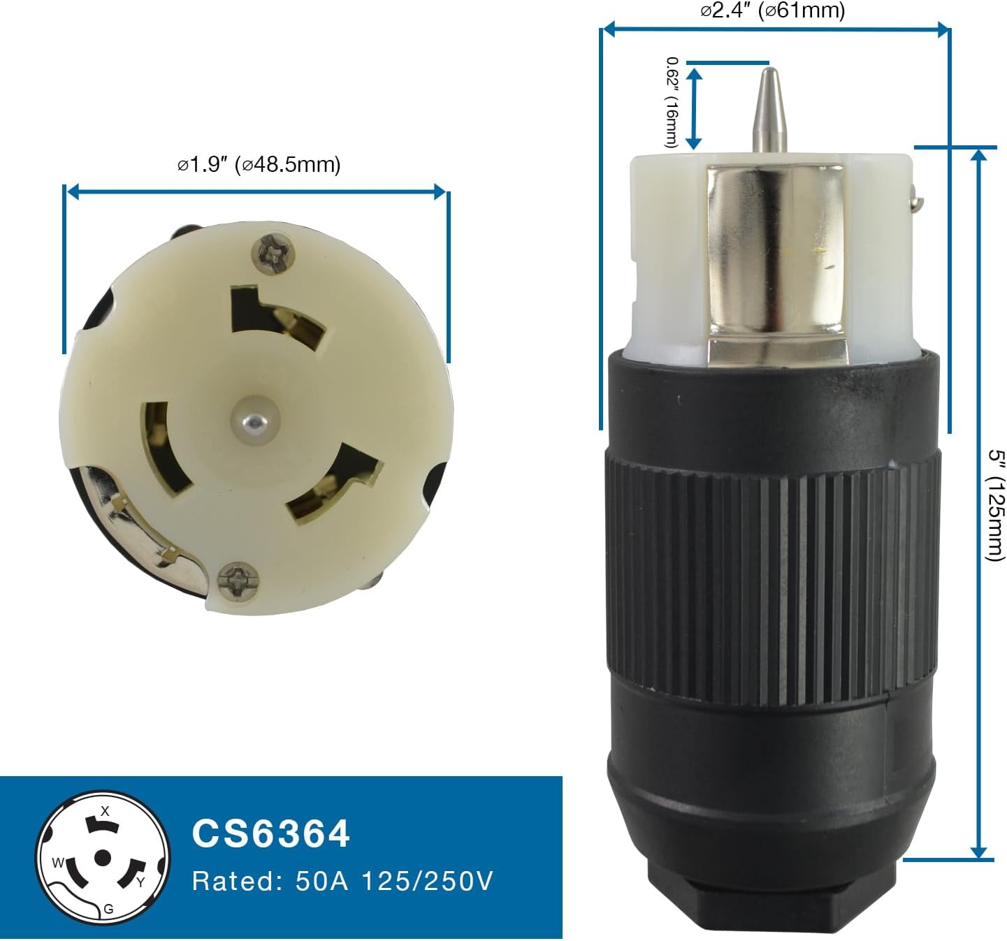 Wiring Device-Assembly Locking Female Connector with center Pin 3 Pole, 4 Wire Grounding, Bladed grab cord type 50A 125/250V CS6364 Comparable with CS6364C Approval: UL, C-UL Limited five year warranty.