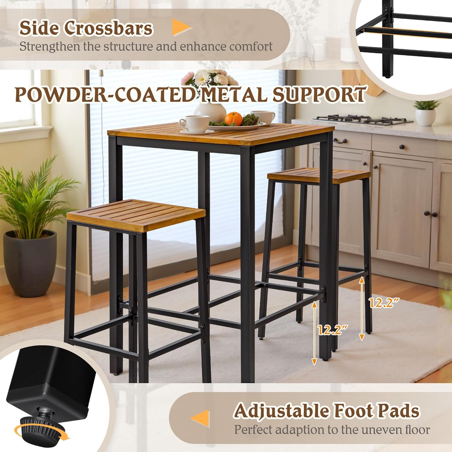 Devoko is a furniture brand dedicated to enhancing home life by offering consumers high-quality products that elevate their living spaces. Devoko's patio bar set is crafted from premium acacia wood, showcasing the natural beauty and strength of solid wood, complemented by a durable metal frame for long-lasting performance. The chairs support up to 300 lbs, while the table offers a 400 lbs capacity, ideal for dining, entertaining, or decor. Adjustable leveling feet ensure stability on uneven surfaces, and reinforced crossbars enhance durability. Suitable for both outdoor (balconies, patios, gardens) and indoor spaces (kitchens, dining rooms), its neutral tones blend seamlessly. Simple assembly takes just 30 minutes. Specifications: Color: Natural Wood Material: Acacia Wood Surface + Metal Structure Package Contents: 1 Bar Table + 2 Bar Stools + 1 Labeled Instruction Manual + 1 Hardware kit