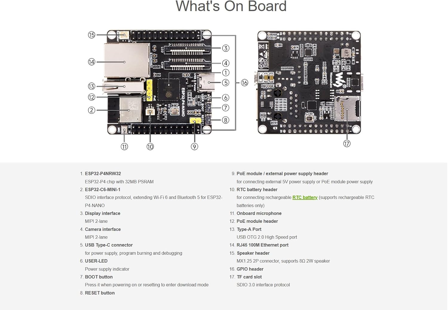 Overview This product is a high-performance development board based on the ESP32-P4 chip with RISC-V dual-core and single-core processors, and features rich Human-Machine Interfaces, including MIPI-CSI (with integrated Image Signal Processor) and MIPI-DSI interface. It supports a comprehensive range of commonly used peripherals including SPI, I2S, I2C, LED PWM, MCPWM, RMT, ADC, UART, and TWAI. Additionally, it offers support for USB OTG 2.0 HS, Ethernet, and SDIO Host 3.0, facilitating high-speed connectivity. The ESP32-P4 chip integrates the Digital Signature Peripheral and a dedicated Key Management Unit, ensuring secure data and operations. Specifically designed for high-performance and high-security applications, the ESP32-P4-NANO meets the advanced requirements of Human-Machine Interfaces, efficient edge computing, and increased IO-connectivity. Features High-performance MCU with RISC-V 32-bit dual-core and single-core processors 128 KB HP ROM, 16 KB LP ROM, 768 KB HP L2MEM, 32 KB LP S-R-A-M, 8 KB TCM Powerful image and voice processing capability. Provides image and voice processing interfaces including JPEG Codec, Pixel Processing Accelerator, Image Signal Processor, H264 encoder 32MB PSRAM in the chip's package, with onboard 16MB Nor Flash Commonly used peripherals such as MIPI-CSI, MIPI-DSI, USB 2.0 OTG, Ethernet, SDIO 3.0 TF card slot, microphone, speaker header and RTC battery header, etc. Adtaping 2*2*13 GPIO headers with 28 x programmable GPIOs Security features: Secure Boot, Flash Encryption, cryptographic accelerators, and TRNG. Additionally, hardware access protection mechanisms help to enable Access Permission Management and Privilege Separation Package Content ESP32-P4-NANO x1 8Ω 2W speaker x1 NOTE: Online Development Resources and Technical Support are provided, please feel free to contact us if you have any problem!