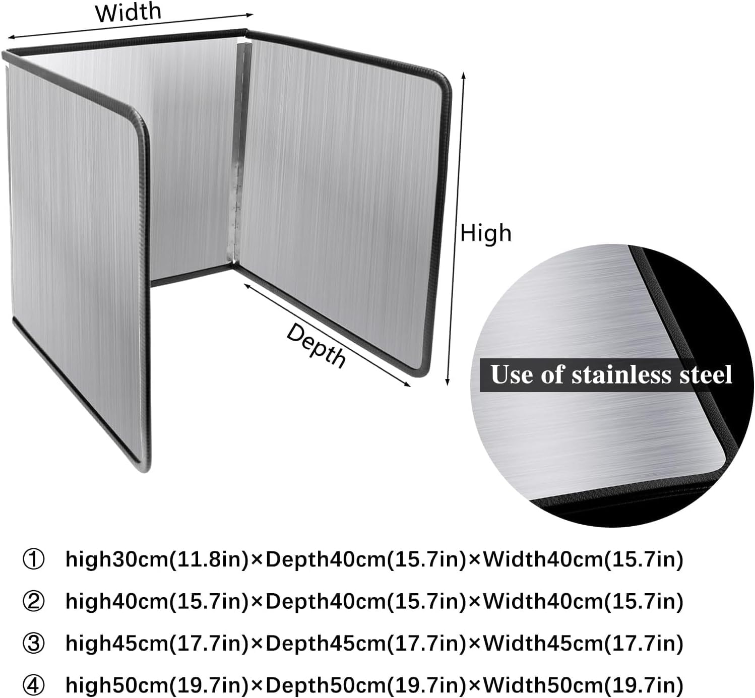 Prevent oil splashes and keep your kitchen clean with our stainless steel oil baffle. This essential kitchen accessory is designed to protect your stove and surrounding areas from oil and food spills during cooking. Crafted from thickened stainless steel, these splatter guards are well insulated to safeguard plastics, spices, and cans from heat damage and deformation. Additionally, they can be used as food wash splash guards for added convenience. Product Details:- Name: Stainless Steel Oil Baffle- Material: Thickened stainless steel- Style: Three-piece fold- Three-piece fold sizes: ①30cm x 40cm x 40cm, ②40cm x 40cm x 40cm, ③45cm x 45cm x 45cm, ④50cm x 50cm x 50cm- Color: Silver- Features: Suitable for various house types; safe and hygienic.Notes:- About size: Please allow a measurement error of 1-3cm due to different measuring methods.- About service: If you have any questions, feel free to contact us; we will respond within 24 hours.