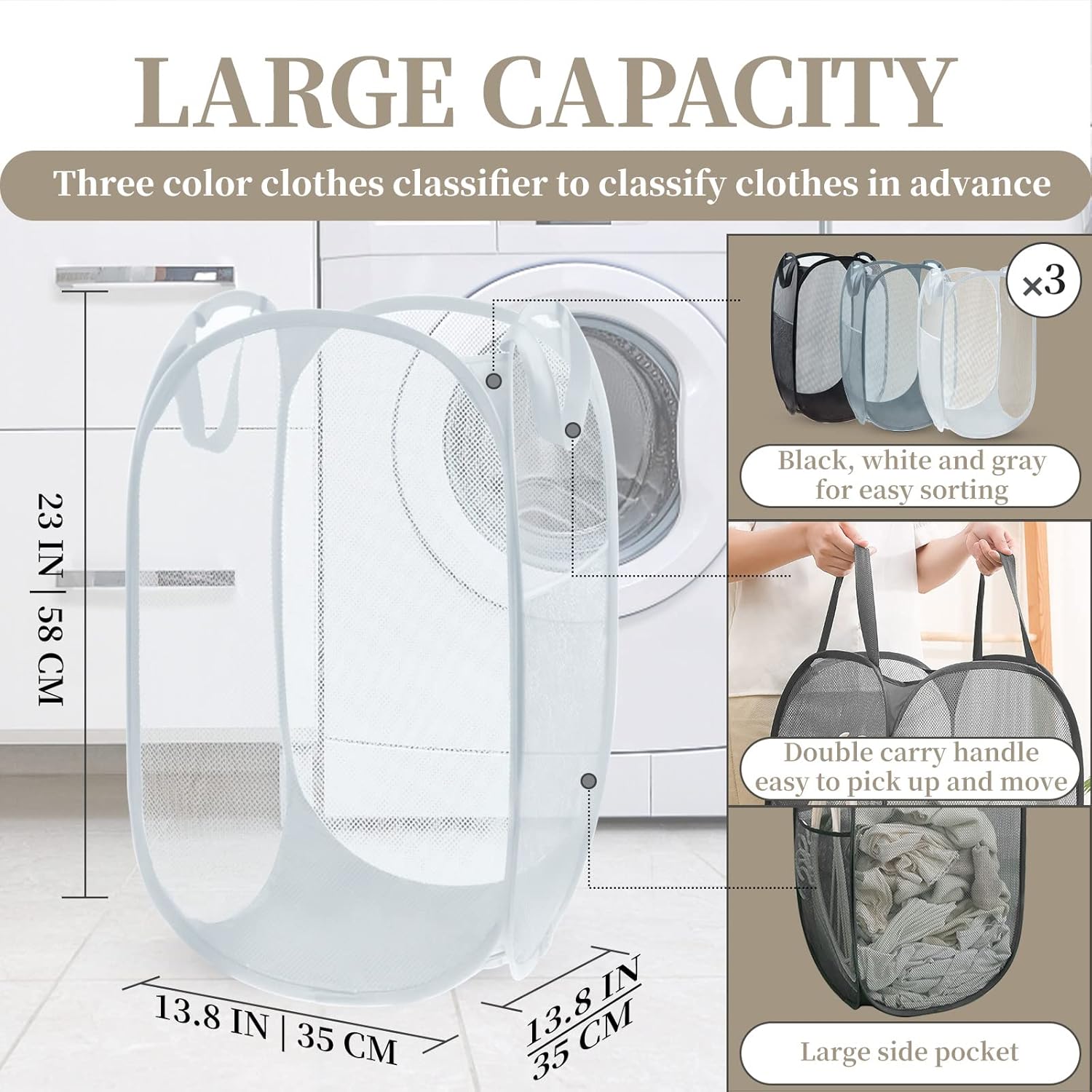 | Recommended Uses For Product | laundry storage, clothes sorting, carrying laundry, off-season clothes storage, gym equipment storage, versatile use in various locations such as laundry room, hotel, college dorm, camping, travel, apartment |