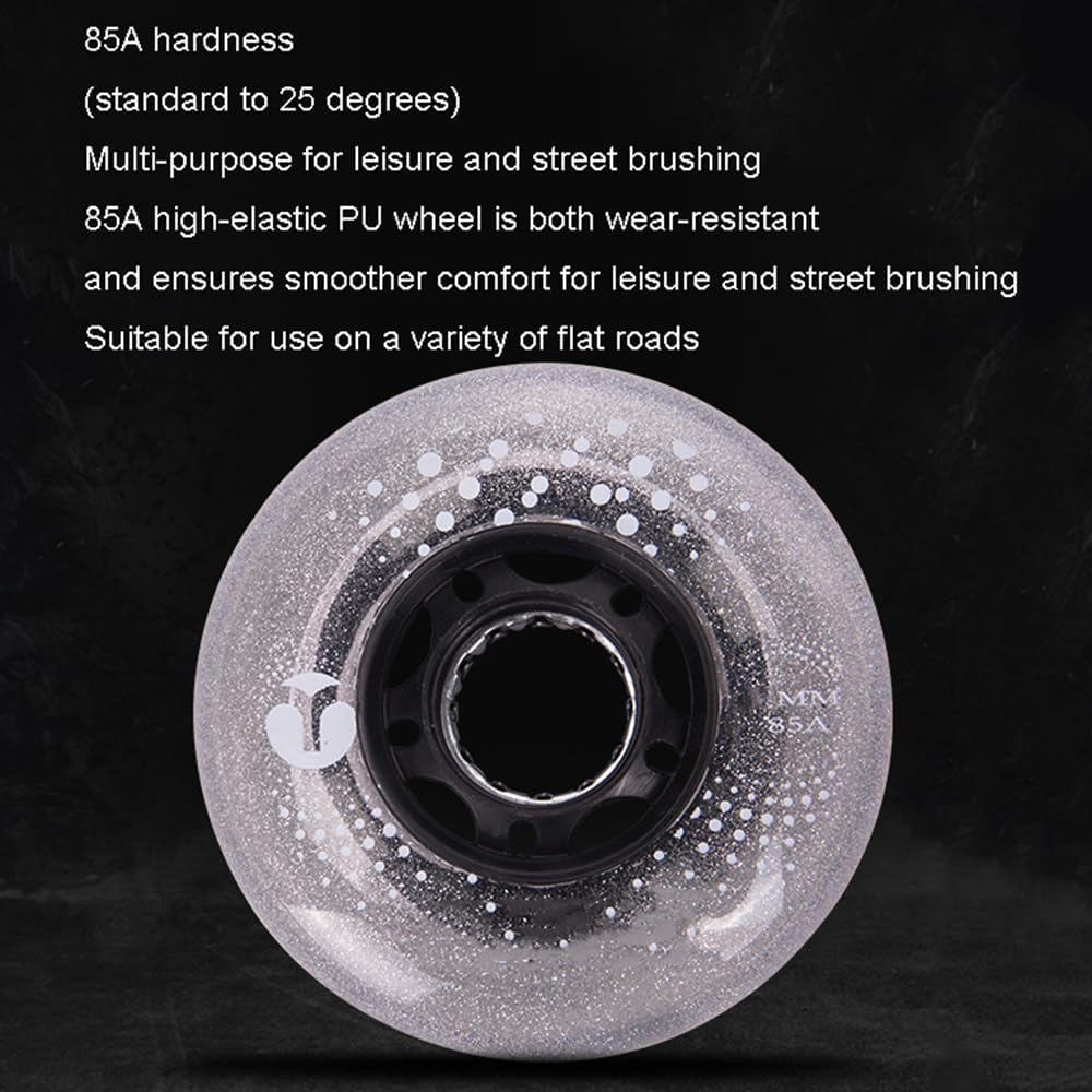 The hardness of the wheels is 85A, which can take care of daily street brushing and action practice. Less impact on your feet and less sound when skating on the street. PU material, not easy to crack.Product SpecificationType: Single rowMaterial: PUHardness: 85ASize: 68mm 70mm 72mm 76mm 80mmApplication: flat flower, street brush, racingPackage Includes4 inline skate wheelsPlease Note:1. Since the size is manually measured, there may be a slight deviation, please understand.2. Due to different displays, there may be slight color differences. Please refer to the actual product received. Please understand.