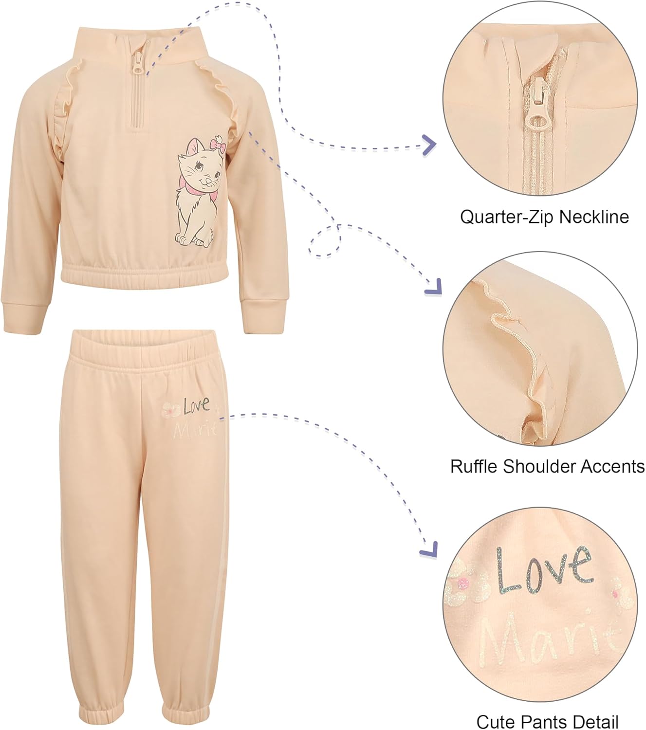 Keep your toddler cozy, stylish, and Disney-ready with the Magic Threadz Disney Clothes Baby Girls 2-Piece Fleece Pullover & Pants Set, featuring officially licensed prints of Minnie Mouse, Marie from The Aristocats, and Stitch from Lilo & Stitch. The soft quarter-zip pullover includes a mock neck for added warmth and easy dressing, while the matching jogger pants have a comfy elastic waistband for flexibility and movement. Made from breathable fleece that’s gentle on delicate skin, this outfit is perfect for chilly mornings, playdates, daycare, or relaxing at home. It's machine washable, durable, and designed to hold up through frequent wear without losing softness or shape. Available in sizes 12M, 18M, and 24M, this adorable Disney set makes a thoughtful and practical gift for baby girls who love character style and cozy comfort.