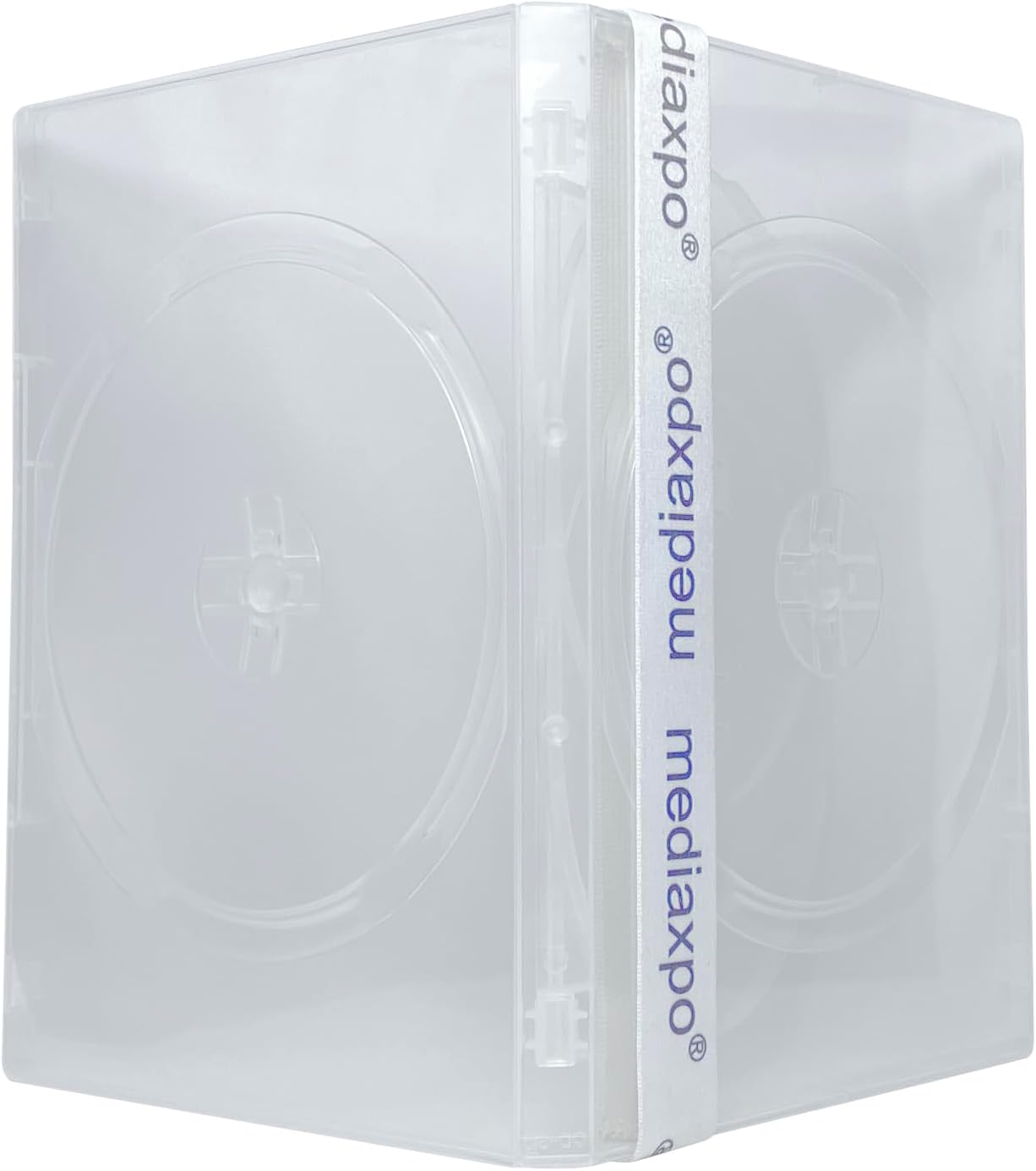 The Quad DVD Case allows you to safely package 4 standard size DVD or CD. A push button hub along with an inner flap for easy media removal and a clear acetate outer cover that allows for case wrap insert. Both attractive and durable the Quad DVD Case is a great packaging solution. Manufacturer: Mediaxpo Specification: ** Category: DVD Cases ** Color: Clear ** Size: Standard ** Thickness: 14mm ** Capacity: 4 Disc Quadruple ** Type: Economy ** Material: Polypropylene ** Measurement: 135mm x 190mm x 14mm (5 3/8 x 7 1/2 x 1/2 inches)