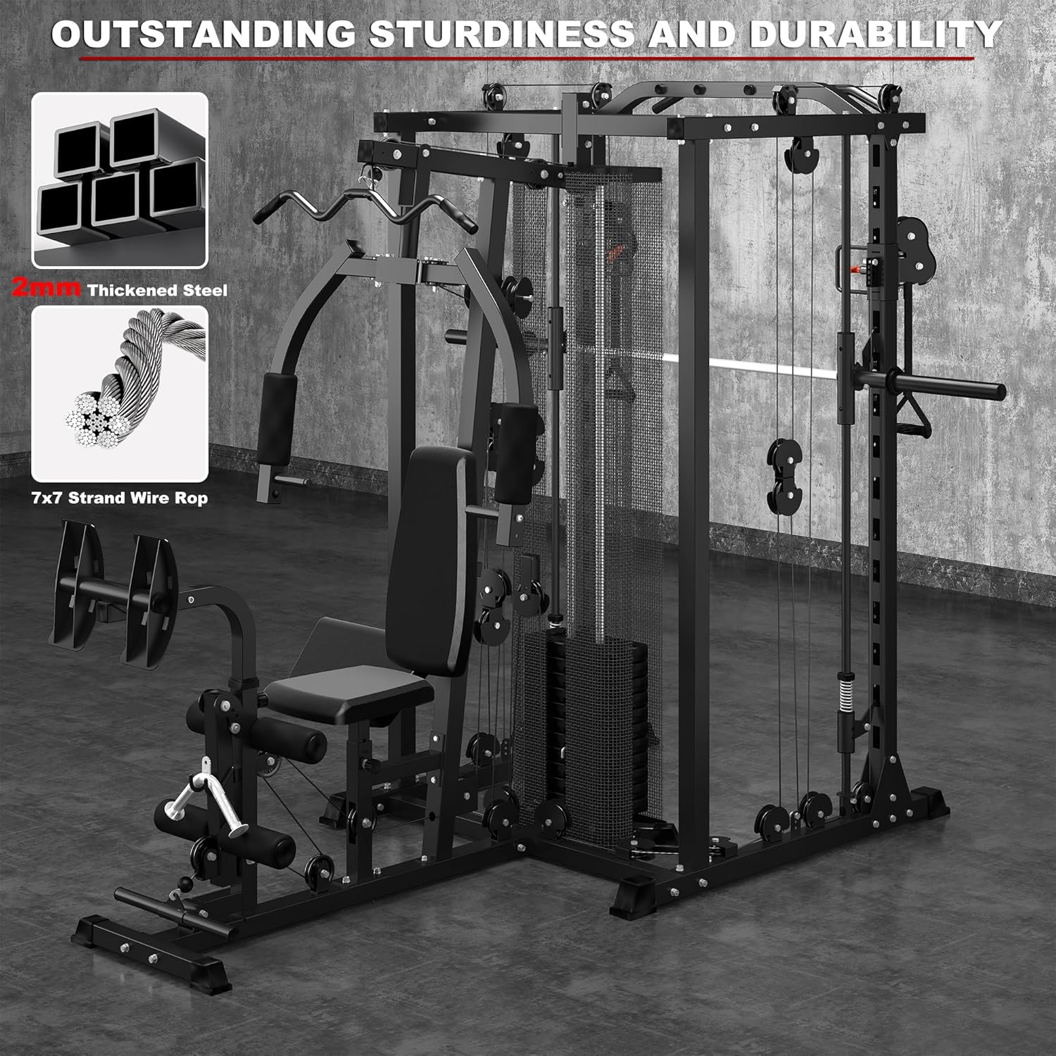 | Included Components | Cable Bar, Lat Pulldown Bar, Ankle Strap, Tricep Rope, Cable Handles x 2, V-Bar Grip Cable, Olympic Rod, Preacher Curl Pad, Leg Press Plate, Smith Bar |