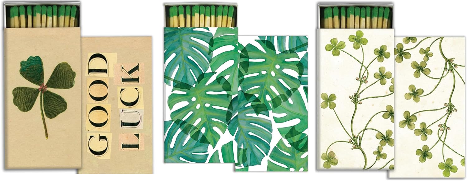 Celebrate St. Patrick’s Day with a curated set of six decorative long matchboxes in rich green botanical designs. This bundle includes two vintage shamrock/good luck matchboxes, two shamrock vine designs, and two bold monstera leaf matchboxes. Each matchbox contains 50 4 inch long green-tipped wooden matches and is designed to be both functional and display-worthy. Whether lighting candles, fireplaces, or creating a festive table setting, these matches elevate everyday moments. This set includes six total matchboxes (2 of each design). Ideal for gifting, entertaining, or seasonal décor.