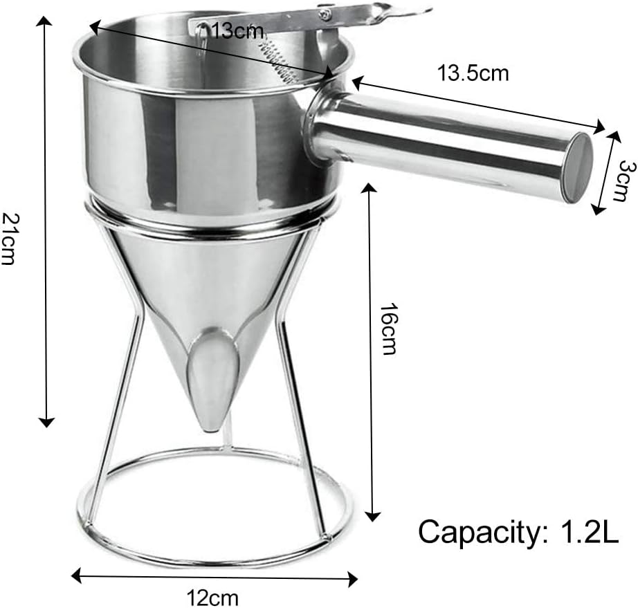 Description:Material: stainless steel.Color: as shown.Size: funnel diameter: 13 cm, height: 21 cm, length of the handle: 13.5 cm.Capacity: 1.2 l.Scope of delivery:1 x funnel.1 x frame.