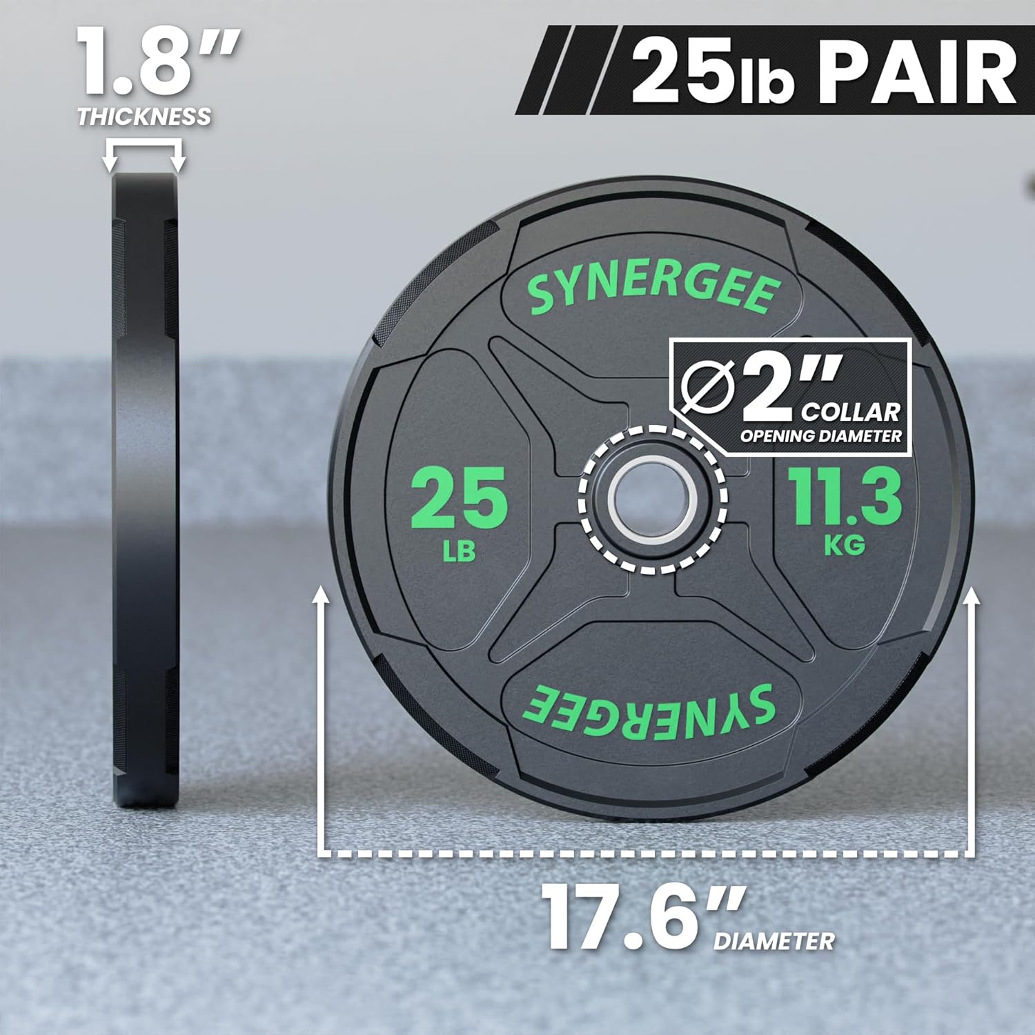 Our Synergee Bumper plates are durable, aesthetically pleasing, and they come with an honest price tag. We don’t charge you for shipping; we only charge for a low-bounce, high-quality rubber polymer bumper plates. When hitting your 1RM, the last thing that should be on your mind is, “Can I drop this if I need to bail?!”. These bumper plates are built to withstand drops - even from overhead - so you can prioritize your safety while challenging PRs. They are durable and dependable, and they save your platform, floors/mats, and bars from damage, too! With a collar opening of 2”, they can be loaded onto any standard barbell; and with their thin profile, you can load 5 x 45 lbs and 2 x 15 lbs plates on a standard bar sleeve (510 lbs total). Each plate has white letter markings that are highly visible, even from a distance. These plates are a must have for any workout that uses Olympic lifts, as well as home gyms, and school weight rooms.