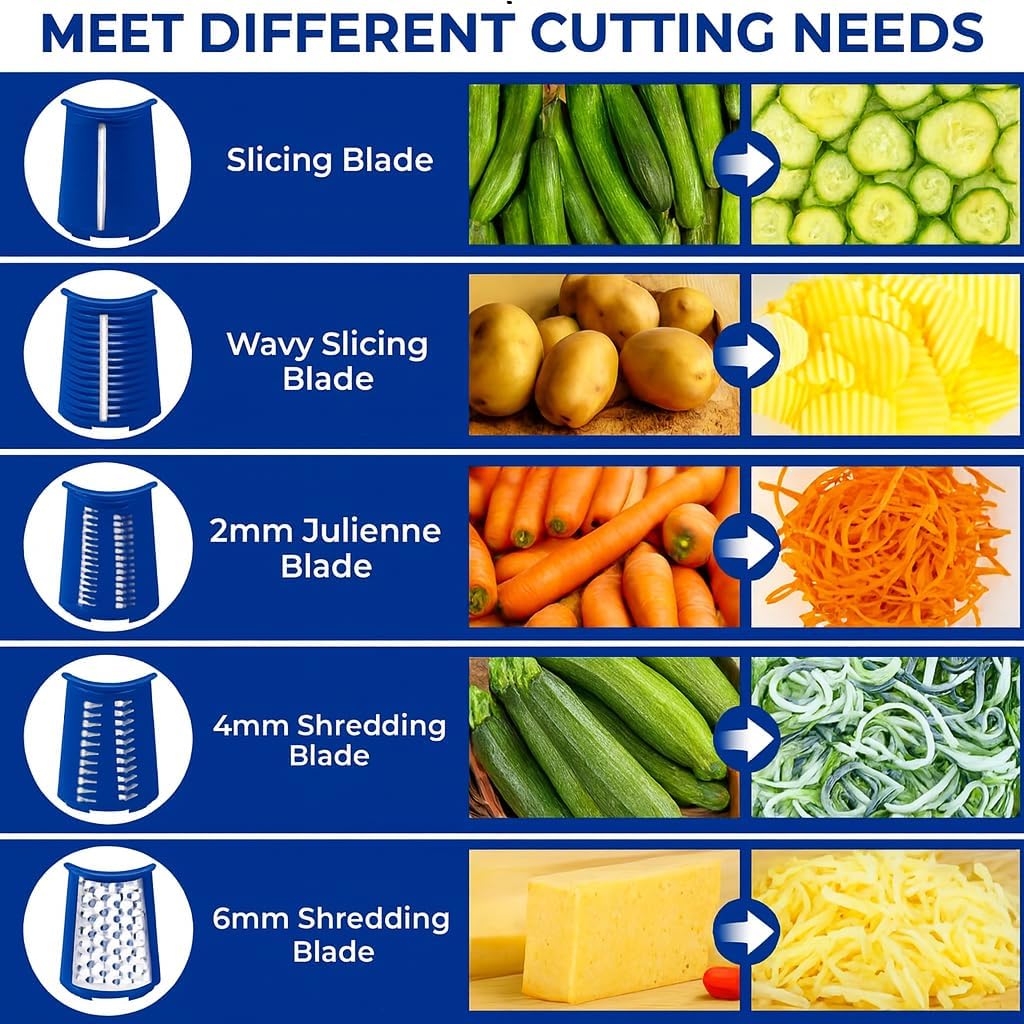 Upgrade your kitchen prep experience with this all-in-one rotary cheese grater with handle, designed to make slicing, shredding, and grating faster, safer, and easier without the need for electricity or complex tools. This thoughtfully engineered tool is ideal for shredding cheese, vegetables, chocolate, nuts, and more with speed and consistency. The grater is built using 18/10 stainless steel blades known for their durability, sharpness, and resistance to rust. The BPA-free housing and food-contact materials ensure your food stays safe from harmful chemicals while you prepare meals with peace of mind. Its clean white and blue finish adds a modern, fresh touch to your countertop, making it both functional and visually appealing. What sets this grater apart is its 5 interchangeable blade that allow for a wide range of cuts, fine grating, coarse shredding, slicing, thick shredding, and decorative wavy cuts. You can switch between blades effortlessly without any tools or advanced skills. Simply insert your preferred blade, load your ingredients into the hopper, and turn the ergonomic hand crank. In just a few spins, you’ll have freshly grated cheese, sliced cucumbers, shredded carrots, or chopped chocolate—ready to use in your recipes. To ensure stability during use, the grater features a powerful suction base that locks tightly onto smooth, clean countertops such as marble or glass. This eliminates slipping and wobbling, providing a safe and stable grating experience. Your hands stay safely away from the blades, making it far safer than traditional handheld graters or box graters that risk scraping your knuckles. Cleaning is just as effortless as prep. The entire grater disassembles in seconds without the need for tools. All removable parts, excluding the suction base and are dishwasher safe, and a blade storage case is included to help you keep your kitchen neat and organized. Its compact, vertical design means it won’t hog cabinet space and is easy to tuck away when not in use. Whether you're preparing ingredients for a weekday dinner, meal prepping, or entertaining guests, this cheese shredder rotary tool saves you time, reduces mess, and delivers precise results with every turn. It’s ideal for a variety of kitchen needs from finely grated Parmesan for pasta to thick vegetable slices for stir-fries. This product is also gift-ready, packaged with care and perfect for housewarmings, weddings, or holiday gifts. An included guide makes setup and use simple for beginners, and our team is always here to support you with reliable, friendly customer service.