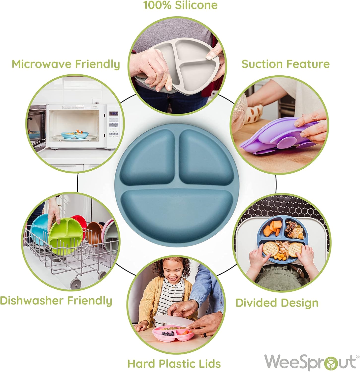 PRACTICAL BUNDLE WeeSprout's dinnerware set transforms mealtime chaos into calm. The strong suction bases keep dishes firmly in place, reducing the mess. Divided plates encourage balanced eating, while deep bowls are perfect for a variety of foods. Lids make storage and transport effortless, ideal for busy families. The microwave-safe material allows quick reheating, saving precious time during hectic mornings or rushed evenings. UNMATCHED QUALITY Crafted from 100% food-grade silicone, this set prioritizes your child's wellbeing. The durable construction withstands the rigors of daily use, resisting chips, cracks, and breaks. Dishwasher-safe for easy cleaning, these dishes maintain their bright colors and smooth texture meal after meal. The thoughtful design combines functionality with kid-friendly aesthetics, making mealtime both practical and enjoyable for the whole family. Elevate your family's dining experience – add the WeeSprout set to your cart today!
